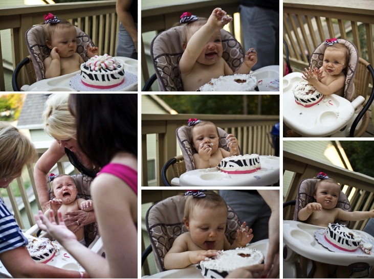We decided to wait to let her have any cake till her party. So her little mouth had never tasted the goodness that is frosting! It was so fun to watch her reaction and to see her dig in for the first time. As you can see by the bottom picture on the left she was not too happy when cake time was over!